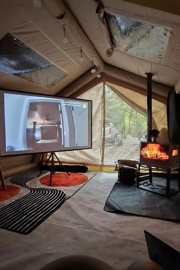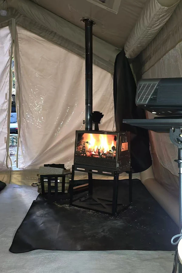 SCÉNARIOS D'APPLICATION CONNEXES Transformez votre expérience de camping en un refuge chaleureux et confortable grâce au poêle à bois révolutionnaire à double pliage . Conçu pour les aventuriers modernes et les adeptes du glamping, ce poêle innovant apporte le charme d'un feu crépitant à toute tente, cabane ou abri de plein air.